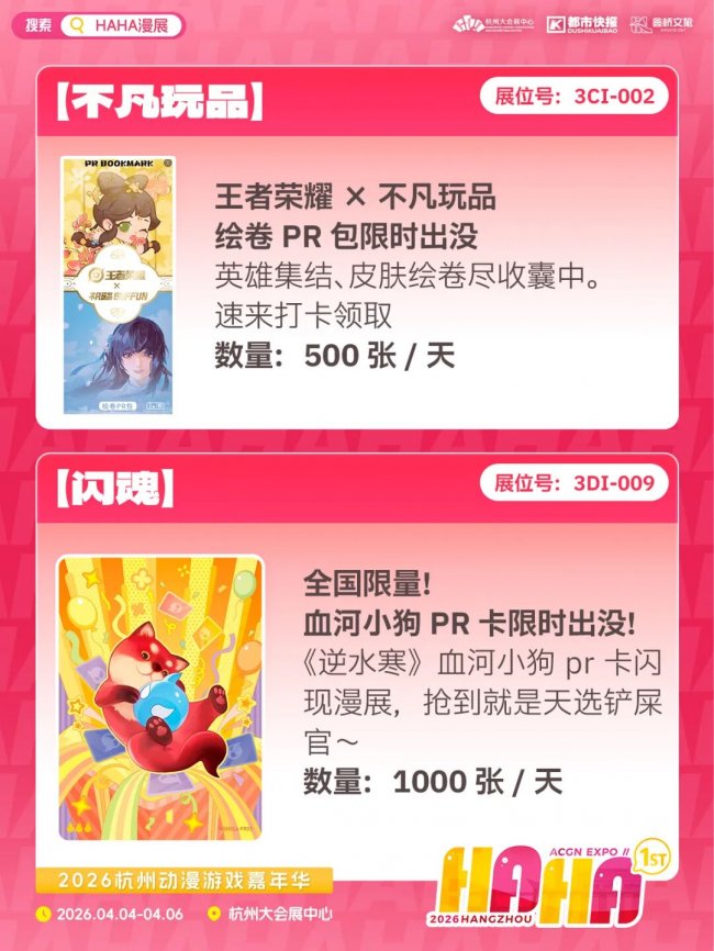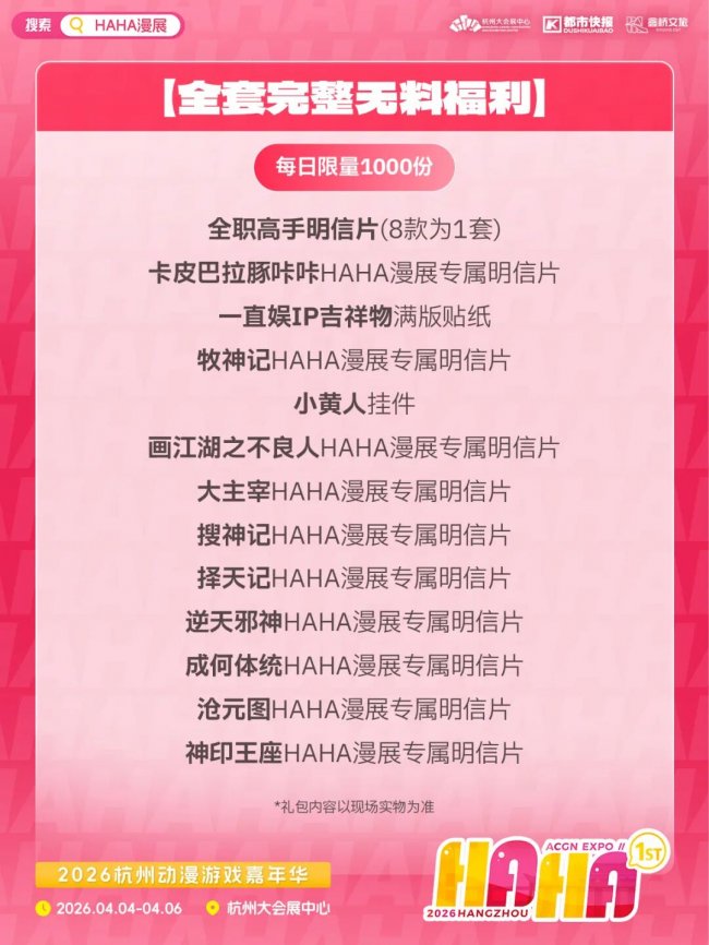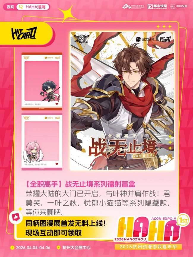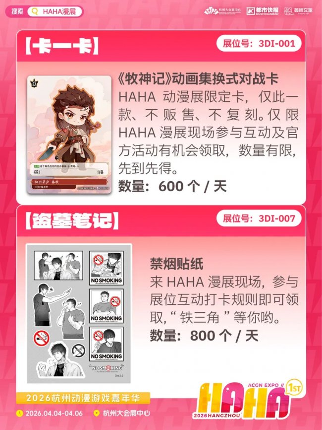在HAHA漫展上,官方IP也来送限量“无料”啦!从《全职高手》透卡、王者荣耀绘卷PR包、《牧神记》动画集换式对战卡、《盗墓笔记》禁烟贴纸……包你领到手软!