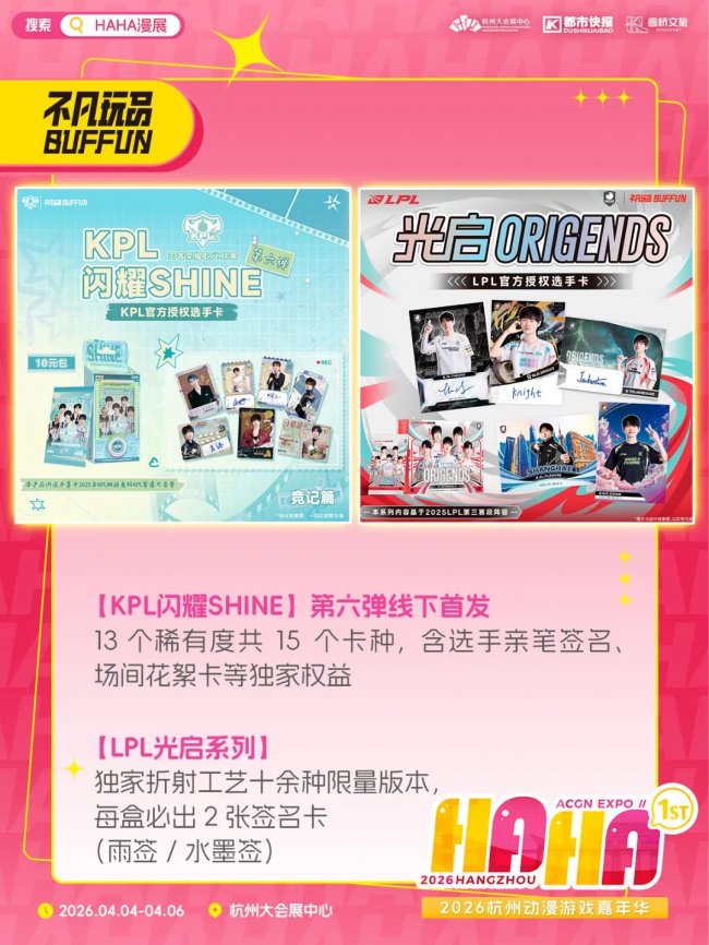 不凡玩品带来含选手亲签的KPL闪耀SHINE第六弹、每盒必出签名卡的LPL光启系列,还有和《王者荣耀》的精美联名周边。