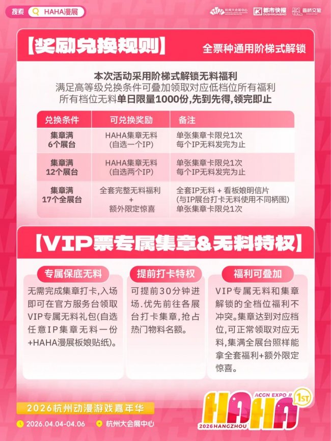 除此之外,你还可以参加漫展官方推出的集章打卡活动,完成指定展位的集章任务(除了下图中官方IP展台,在杭州银行、麦当劳的展位也可集章),就能免费兑换“无料”大礼包。大礼包中的各项福利,都是漫展主办方联合IP官方一起推出的限定礼物哦。